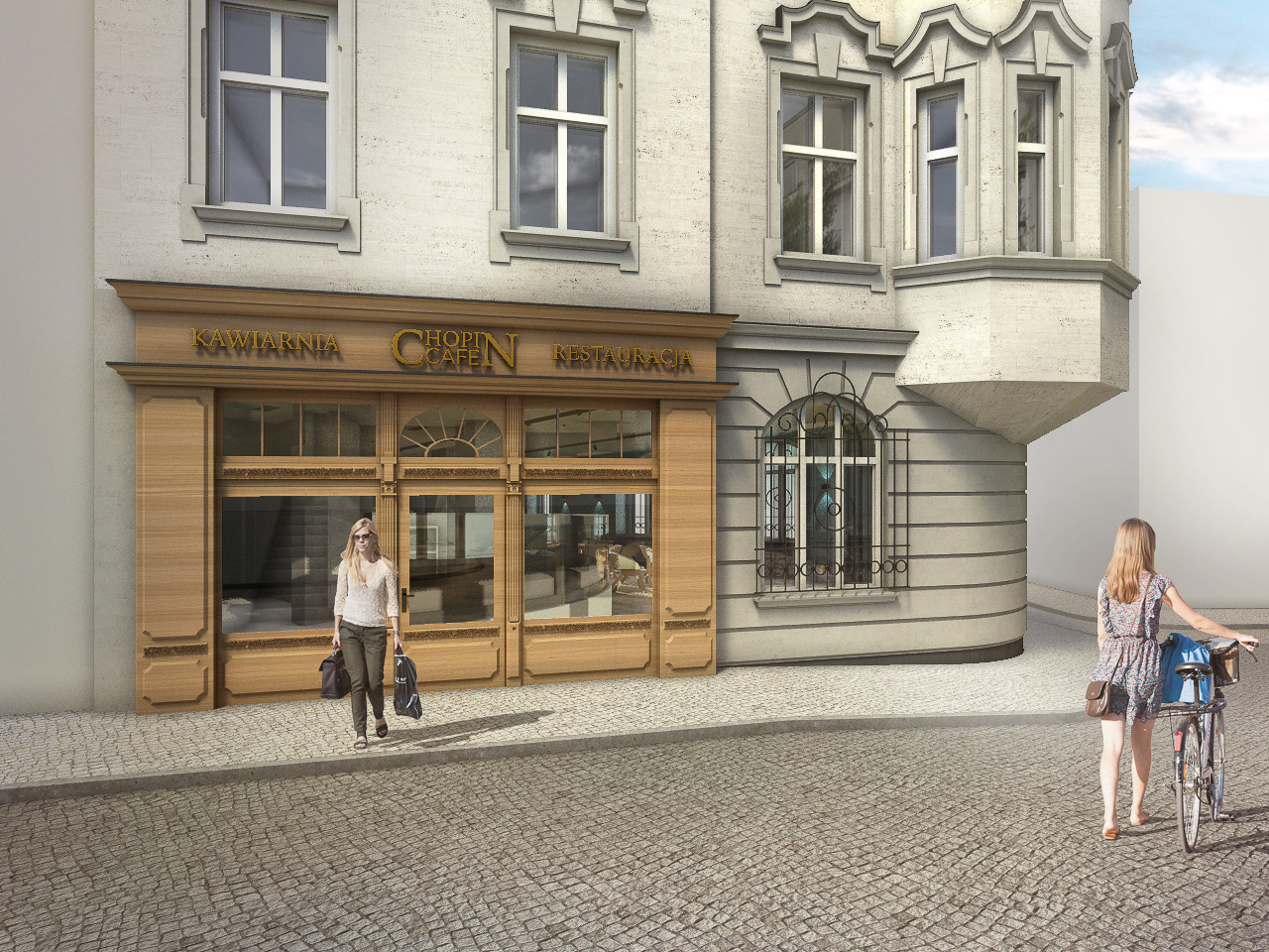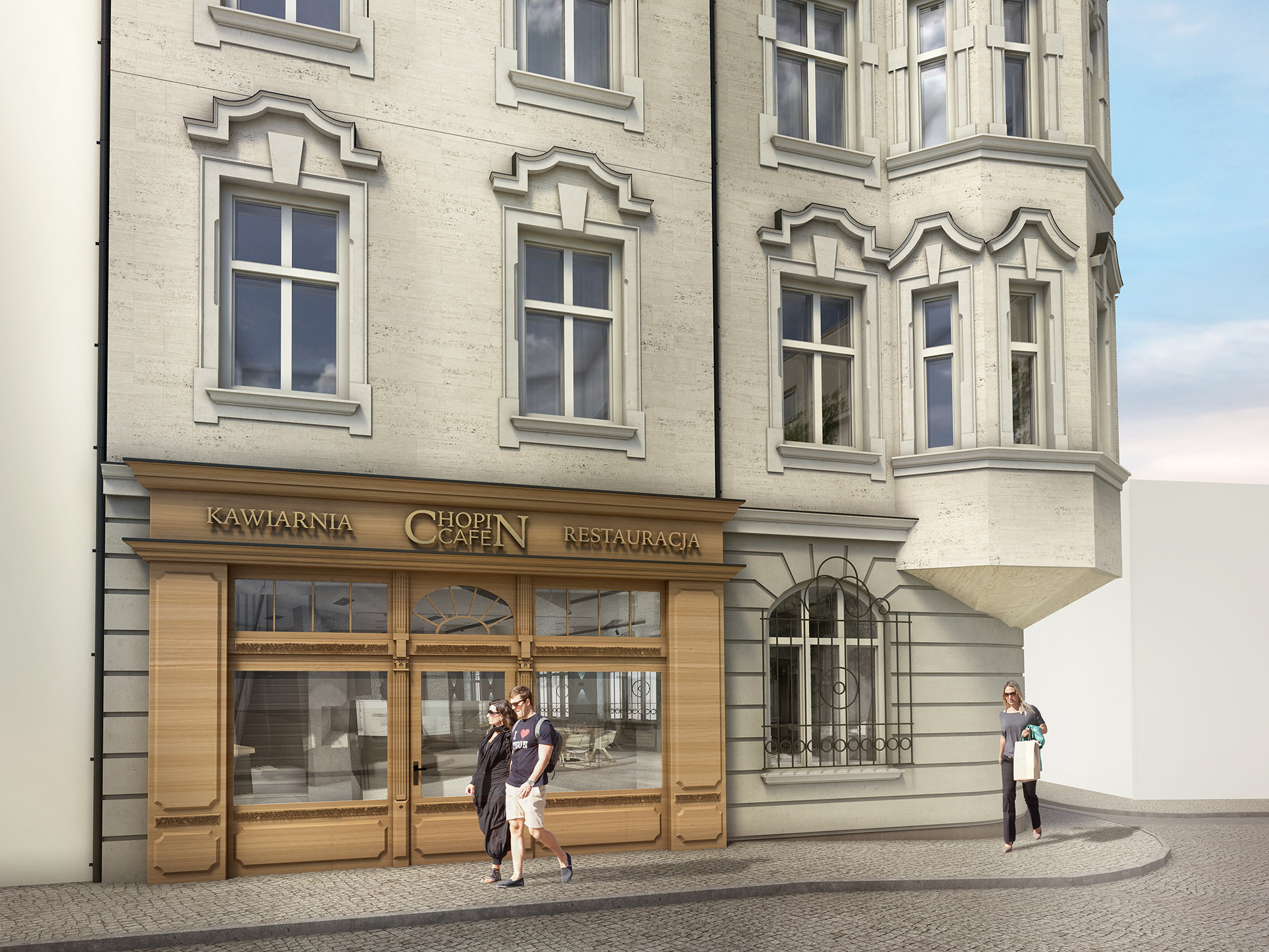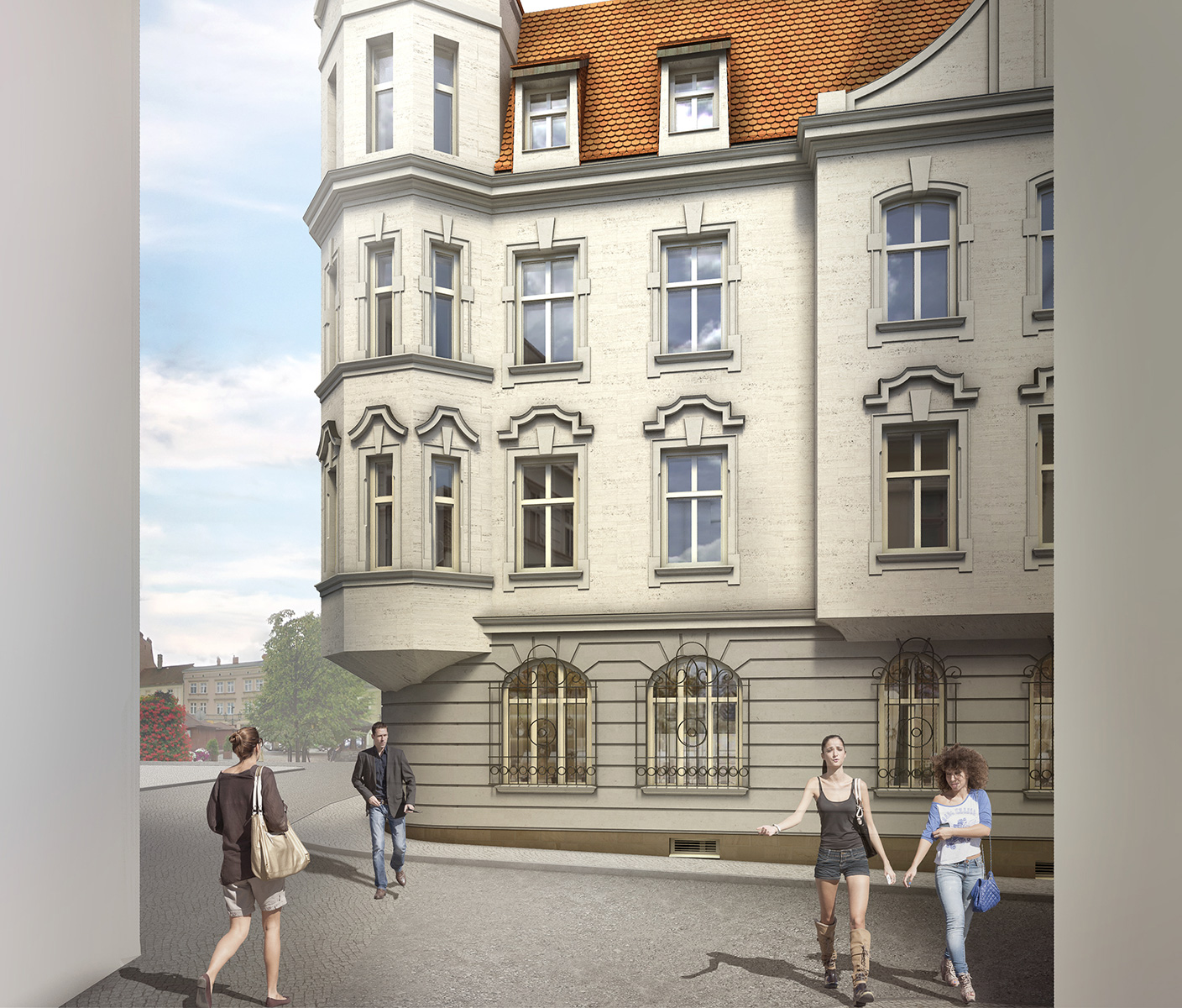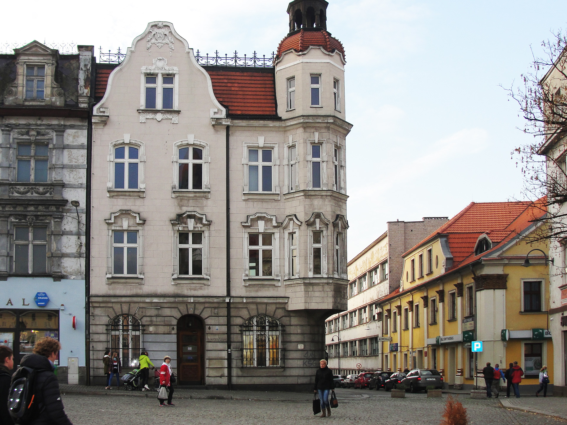 Charakterystyczna narożna kamienica w stylu secesyjnym na Rynku w Tarnowskich Górach. Kompleksowy projekt rewitalizacji, przebudowa wnętrz na restaurację i pomieszczenia biurowe.